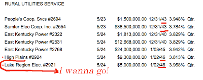 Note the long maturities and % rates. 35-year money for Lake Land (sounds like a nice place) at Treasuries +30. The following is a pic of all the re-financing's for May and June. I shrunk it because it would just clutter the page; it’s that long. Blow it up on your own or go to the FFB site and look up Press Releases. This goes on every month of the year. This stinks of boondoggle and pork. What are the administrative costs to oversee this? There has to be a better way.